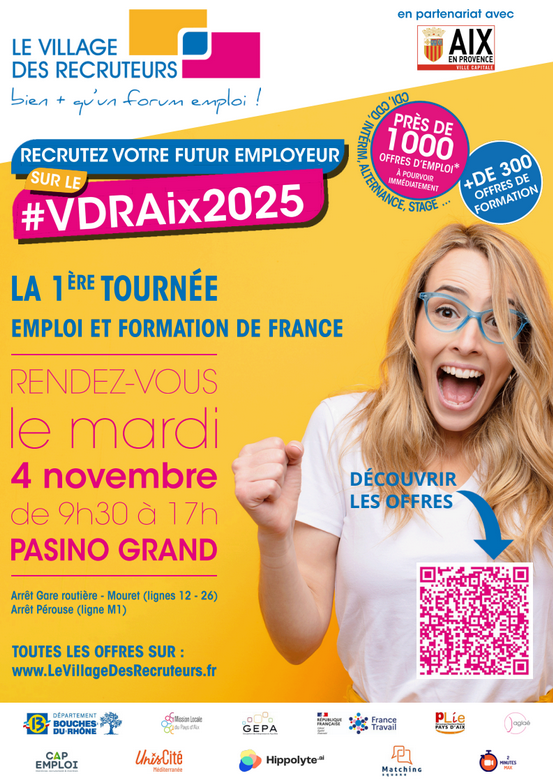Organisé par l’agence Aglaé, en collaboration avec la ville d’Aix-en-Provence et avec le soutien des acteurs de l’emploi et du développement économique, près de soixante-dix entreprises et centres de formation seront présents lors du Village des Recruteurs d’Aix-en-Provence 2025 pour rencontrer et échanger avec plusieurs candidats.