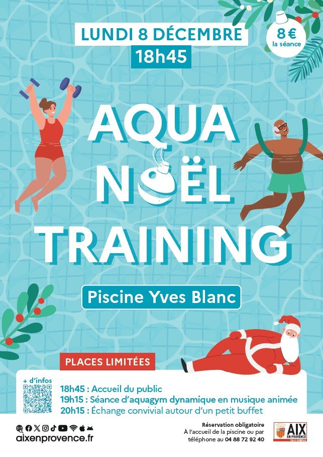 La piscine Yves Blanc vous invite à un moment unique de sport, de musique et de convivialité. Venez bouger, rire et partager un bon moment avant les fêtes, dans une ambiance lumineuse et chaleureuse.