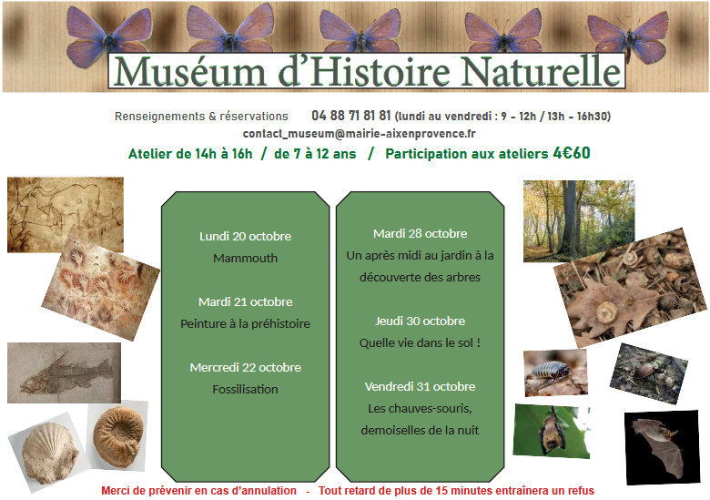 Pour une meilleure gestion des ateliers, merci de prévenir le muséum en cas d’annulation. Tout retard de plus de 15 min entraînera un refus.