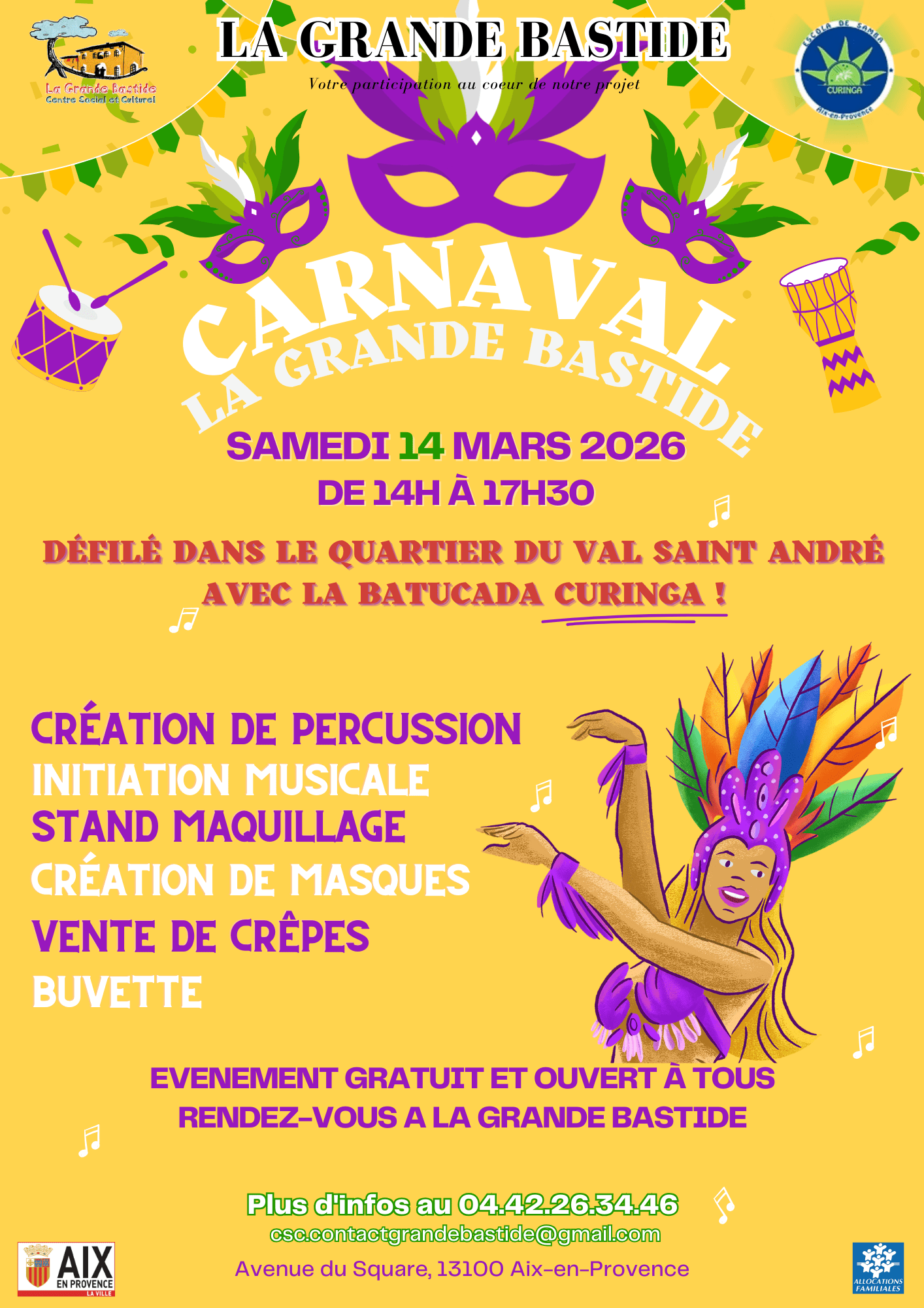 - 15h30 : Départ du défilé depuis l’avenue du Square, pour une déambulation dans le quartier Val St André. La batucada Curinga accompagnera le défilé au son des percussions brésiliennes.