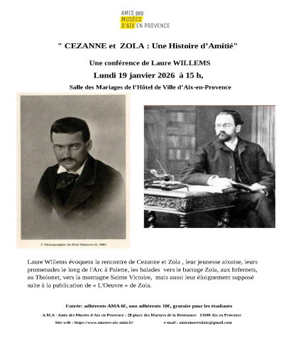 Laure Willems évoquera la rencontre de Cezanne et Zola , leur jeunesse aixoise, leurs promenades le long de l’Arc à Palette, les balades vers le barrage Zola, aux Infernets, au Tholonet, vers la montagne Sainte Victoire, mais aussi leur éloignement supposé suite à la publication de « L’Oeuvre » de Zola.