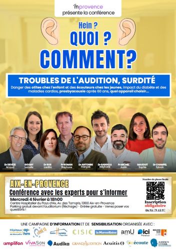 - 18h30 : La presbyacousie et ses solutions : l’appareillage auditif pour qui ? Et à quel prix ? Dr Sylvain CHAMPEL, chirurgien ORL , Centre hospitalier intercommunal Aix-Pertuis (CHIAP) et Dr Laëtitia ROS, Chirurgien ORL, Hôpital de la Conception (APHM)