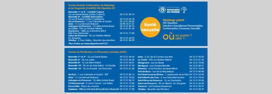 TROD possible dans les locaux de Marseille (106 boulevard National) tous les vendredis sans rendez-vous (sauf pendant les vacances scolaires).