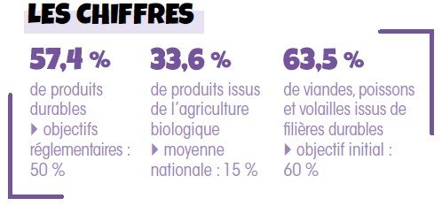 Ces denrées sont toujours choisies pour leur valeur nutritive et leur faible impact environnemental : bio et HVE sans pesticides chimiques, viandes Label Rouge, poissons labellisés pêche durable, fromages AOP et IGP.