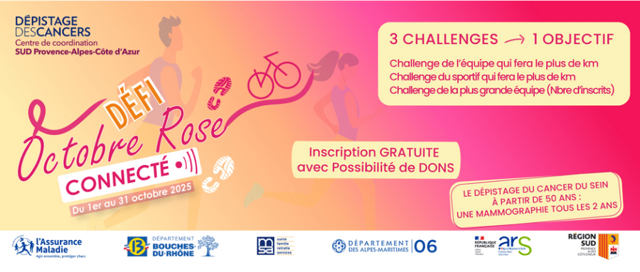 Enfin, tout au long du mois revient le défi connecté octobre rose 2025 organisé par le CRCDC SUD PACA : lien d’inscription