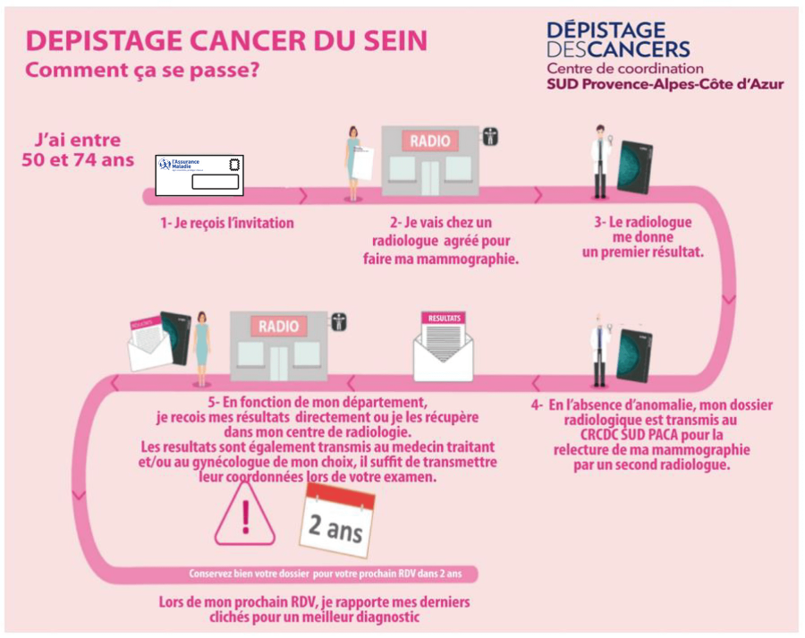 Infos complémentaires - Si vous êtes une femme âgée entre 50 et 74 ans, suivez le processus de dépistage organisé par le CRCDC Sud Paca. Des programmes spécifiques sont proposés à celles qui ont une prédisposition familiale ou une susceptibilité génétique.