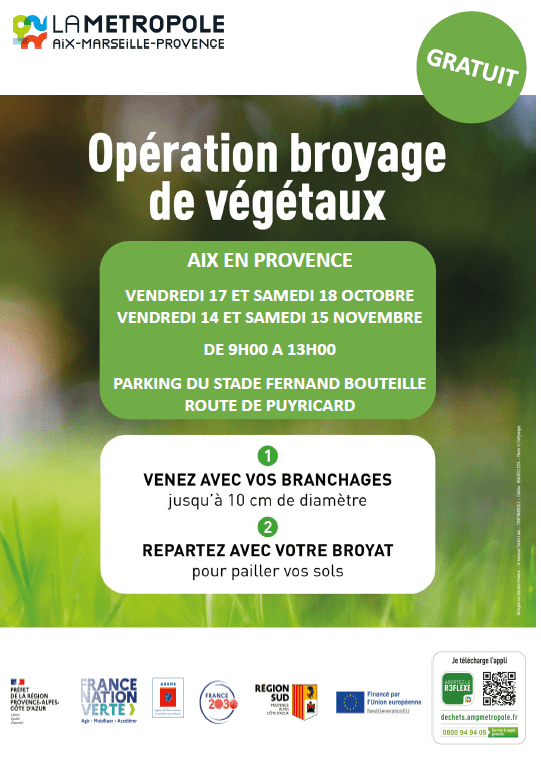 Les 17 et 18 octobre, de 9h à 13h, la Métropole Aix-Marseille-Provence organise une opération broyage de végétaux sur le parking du stade Fernand Bouteille, route de Puyricard à Aix-en-Provence.