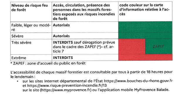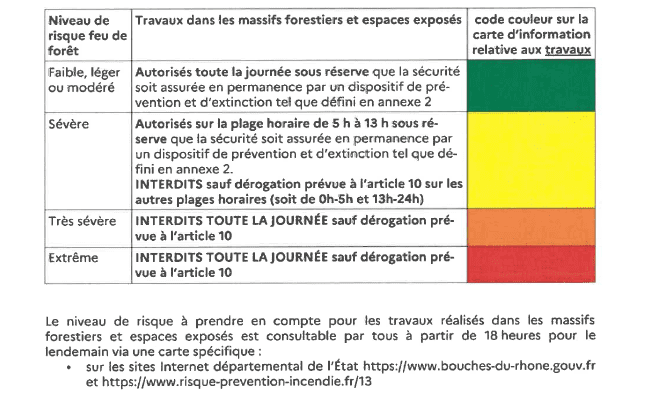 Pendant les mois de juin, juillet, août et septembre, les organisateurs de manifestations publiques ou tournages audiovisuels professionnels prévus dans les massifs forestiers des Bouches-du-Rhône sont tenus d’en faire la déclaration au maire, à la DDTM et au service d’incendie et de secours territorialement compétents au moins deux mois avant la date prévue. À défaut de cette déclaration, la manifestation publique ou le tournage professionnel sont interdits. Le préfet peut décider de réglementer ou interdire la manifestation publique ou le tournage déclaré si le niveau de risque l’exige.