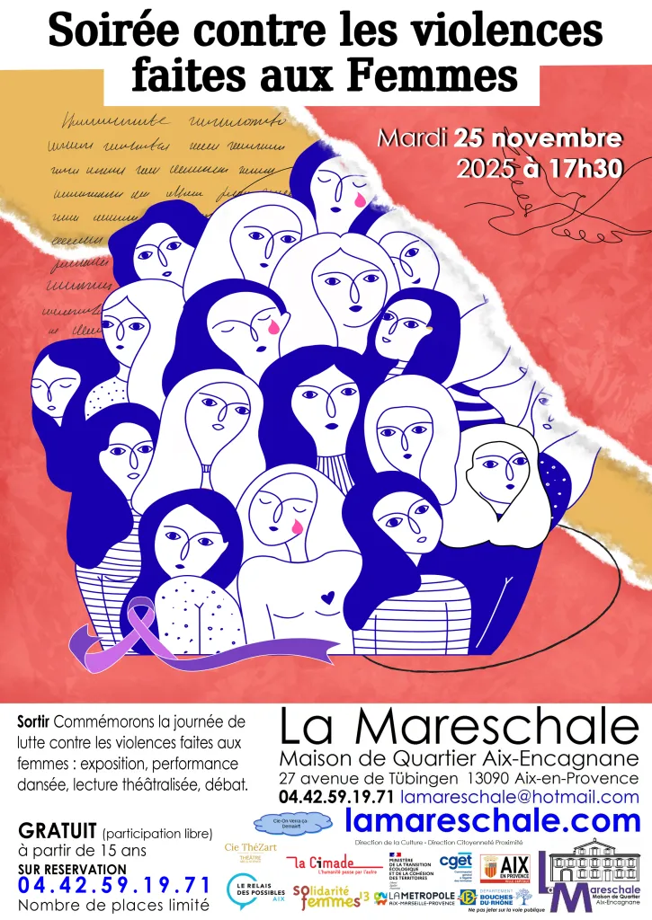 La Cimade - Aix en Provence, le Collectif Agir, la LDH, Amnesty, SOS Méditerranée organisent l’exposition nationale itinérante de photographies : L’atelier des femmes fortes, construite par un groupe de 15 femmes en situation d’exil qui se sont nommées ainsi. Accompagnées par la photographe Fatoumata Diabaté et l’association La Cimade, elles alertent par l’image et l’écriture sur les violences exercées sur celles qui sont femmes et étrangères. - Lecture théâtralisée : Fragments de Femmes