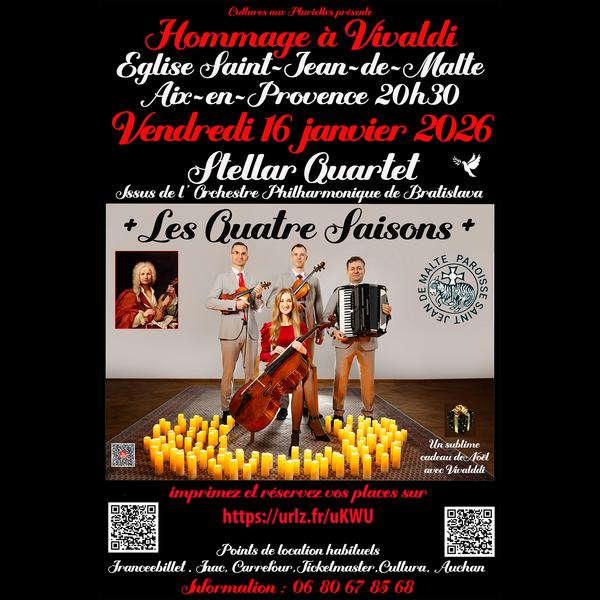 Stellar Quartet = Hommage à Vivaldi. Cultures aux Plurielles présente les soirées "Prestige Classique". Stellar Quartet est issu de l’Orchestre philharmonique slovaque de Bratislava.