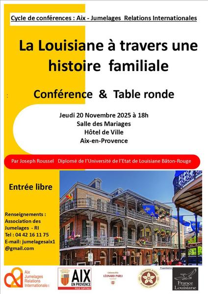 L’Association des Jumelages et des Relations Internationales d’Aix, en collaboration avec l’association France-Louisiane, vous convie à une Conférence & Table ronde : La Louisiane à travers une histoire familiale, le jeudi 20 novembre 2025, à la Salle des Mariages de l’Hôtel de Ville d’Aix, à 18h, par Joseph Roussel, un Louisianais dont l’histoire familiale témoigne des multiples influences qui ont façonné un territoire culturel qui continue à nourrir l’imaginaire français. Entrée libre et gratuite, sans réservation. Vous pourrez voir la Louisiane à travers les yeux d’un natif, et aller au-delà des clichés touristiques. La conférence sera illustrée par des projections d’images, des cartes et des photos de famille. Elle se terminera par une table ronde avec questions et réponses