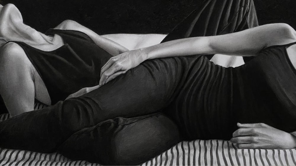 Le fusain, médium que j’affectionne pour sa fragilité et sa sensualité, parle lui aussi de tendresse. Pour la réalisation de mes images je dois effleurer le papier, caresser la surface plutôt que la contraindre, étaler délicatement la poudre de fusain avec des pinceaux, retenir mon geste pour préserver la lumière d’une trace. Travailler au fusain c’est être attentif à l’équilibre précaire entre apparition et effacement. Souvent reléguée ou oubliée, la tendresse est pourtant essentielle à toute forme d’amour. Je cherche ainsi à convoquer la douceur, non pas comme un refuge naïf mais comme un acte de résistance. La tendresse devient ici un langage qui, au-delà du sentiment amoureux, traduit une attention à l’autre, une manière de renouer avec l’humain. « Au coeur du Tendre » est ainsi une cartographie intime et symbolique : un territoire d’images où la tendresse se fait matière, mémoire et présence.