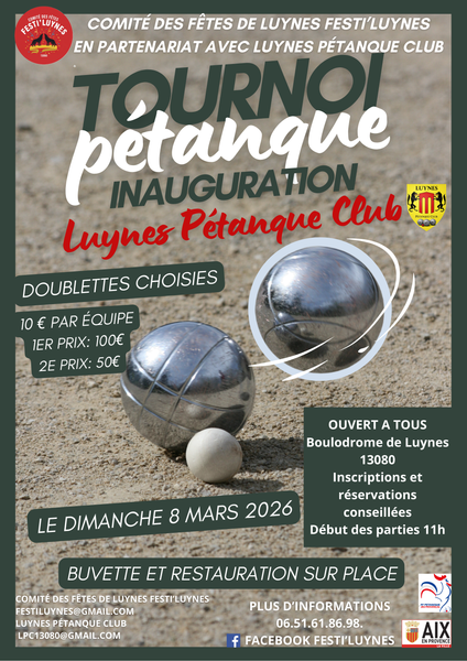 Que vous soyez joueur, curieux, en famille ou entre amis, venez vivre une journée historique pour Luynes et partager un grand moment de convivialité ! On compte sur vous pour venir très nombreux et faire de cette inauguration un événement mémorable ! Invitez vos amis, formez vos doublettes et rendez-vous le 8 mars !