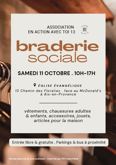 L’association En Action avec toi 13 organise une braderie sociale le samedi 11 octobre 2025, sur le parking de l’église évangélique (13 chemin des Floralies).