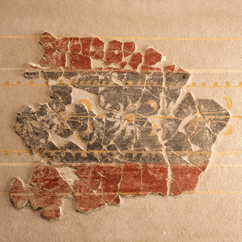 Les stucs, également très présents dans la décoration des maisons, mais que leur naturelle fragilité a rendu plus vulnérable encore à l’usure du temps, couronnent généralement les zones hautes des parois sous la forme de corniches moulurées. Observés à plusieurs reprises dans l’effondrement des plafonds et des murs, ces éléments ont rarement été conservés.