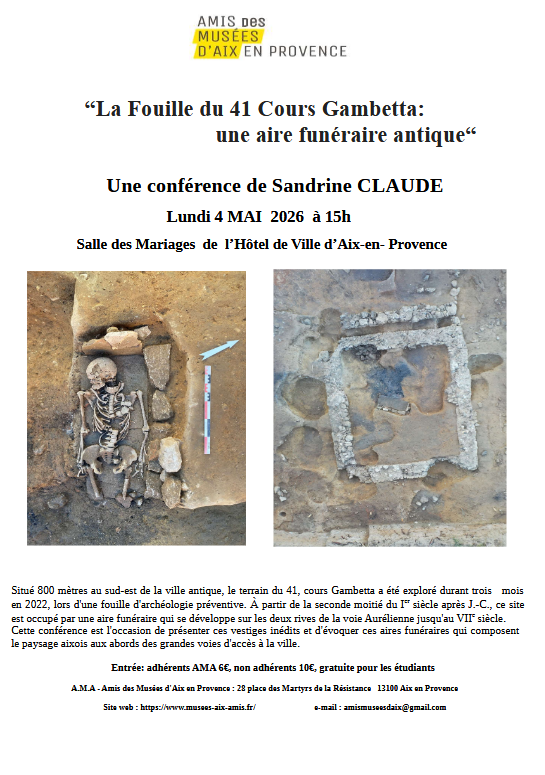 Cette conférence est l’occasion de présenter ces vestiges inédits et d’évoquer ces aires funéraires qui composent le paysage aixois aux abords des grandes voies d’accès à la ville.
