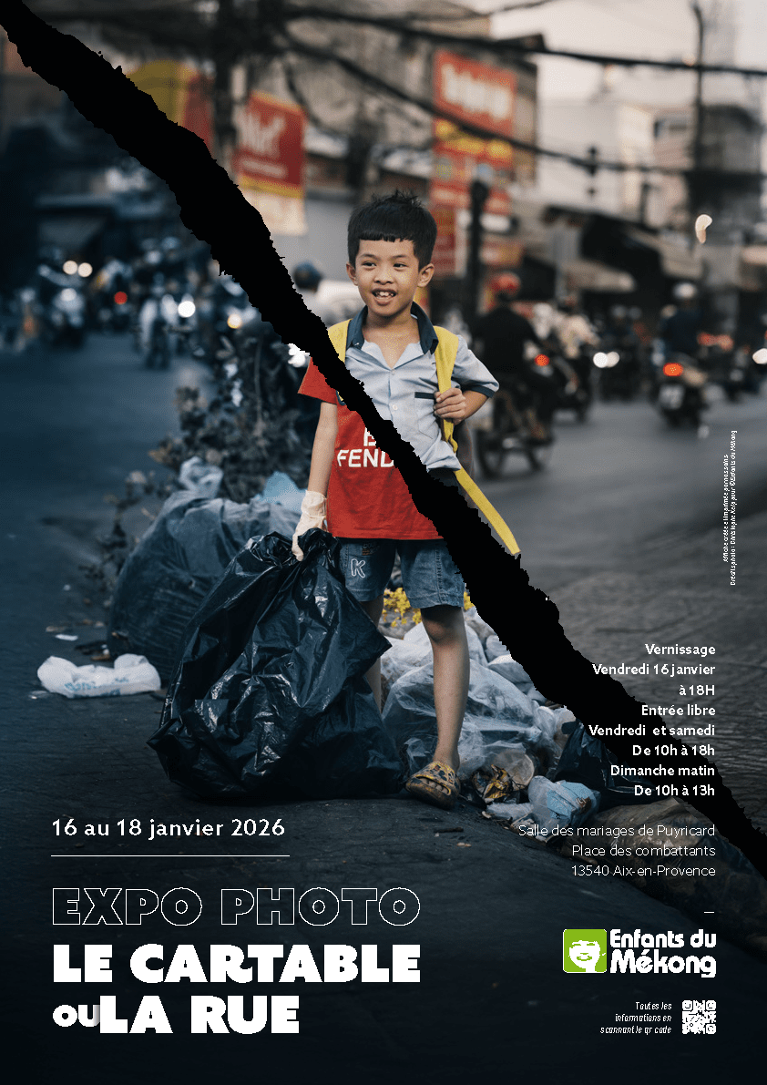 La nouvelle exposition-photo de l’association Enfants du Mékong illustre ce bras de fer : d’un côté, le travail, imposé par la pauvreté et la nécessité de survivre ; de l’autre, l’école, promesse d’avenir...