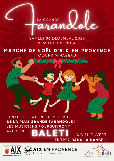 La farandole c’est provençal et c’est une danse déambulation très simple, entraînée par un meneur, sur une musique d’instruments traditionnels qui pour l’occasion est jouée par un groupe de la région et des musiciens d’Aix Balèti.