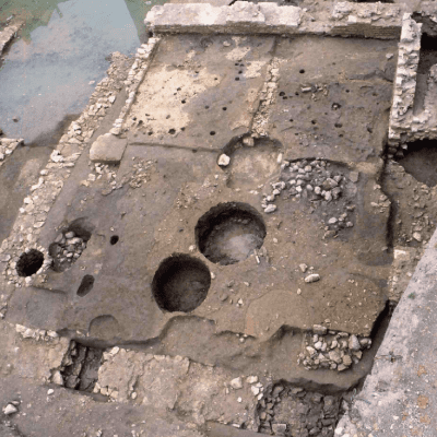 - Bâtiment de plan basilical découvert sur le site de l’établissement des Thermes Sextius en 1991