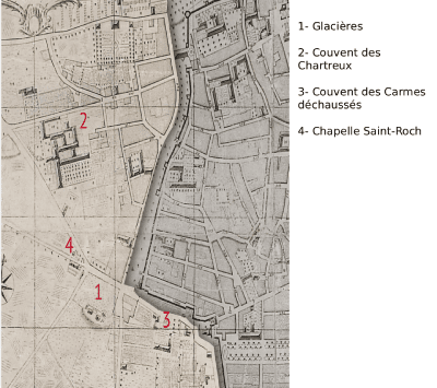 Le bâti se densifie, enfin, dans ce secteur qui offrait encore aux portes de la ville, de vastes espaces libres, avec la multiplication des fondations religieuses. En 1634, les Chartreux sont les premiers à s’établir à l’ouest du faubourg des Cordeliers, suivis en 1647 par les Carmes Déchaussés dont les fondations du couvent construit en 1671 ont été retrouvées en 2004, à l’ouest de la Rotonde. La construction d’une chapelle sous le vocable de Saint-Roch, au débouché de la rue Irma-Moreau, fait suite à la peste de 1720.