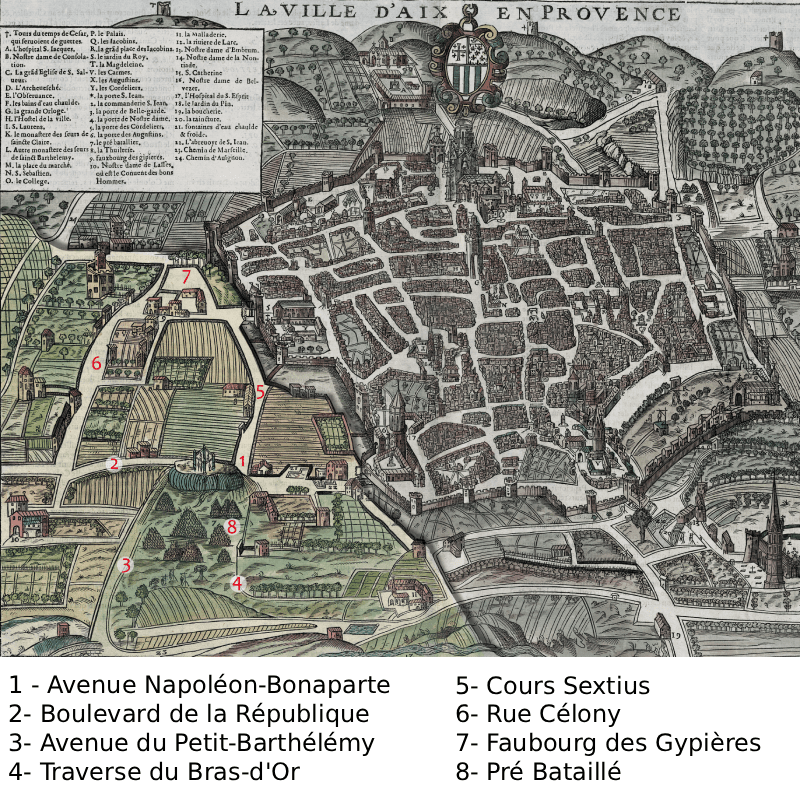 Point de départ de cette évocation, le plan de Belleforest montre que le découpage des rues et chemins est déjà bien en place en 1575. On suit, en effet, parfaitement le dessin de l’avenue Napoléon-Bonaparte et, dans son prolongement, le cours de la République (chemin d’Avignon), sur lesquels débouchent la traverse de l’Aigle-d’Or, le chemin du Petit-Barthélémy dont les fouilles ont démontré l’origine antique, et la traverse du Bras-d’Or. Immédiatement au nord, l’axe du cours Sextius existe déjà, ainsi que les rues Van-Loo, Célony et de la Paix, autour desquelles s’organise le faubourg des Gypières ou des Cordeliers. Ce système n’évoluera qu’à la fin du XVIIIe siècle, avec la création du cours des Belges et de la place de la Rotonde, et l’alignement de certains axes de pénétration du corps de ville (cours de la République, avenue Bonaparte).