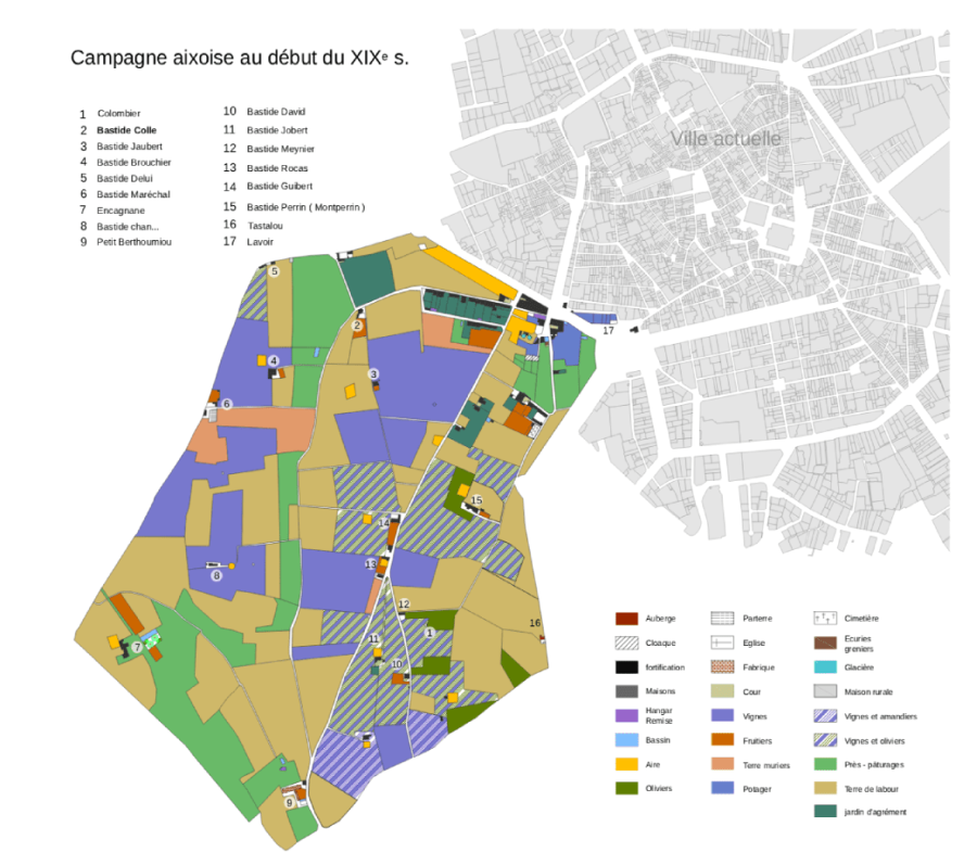 L’habitat dans le faubourg des Cordeliers a investi les bâtiments laissés vacants par les Chartreux, plus à l’ouest ; il se développe discrètement sur la rive sud de la traverse de l’Aigle-d’Or (rue Irma-Moreau). Aux abords des glacières communales encore en usage, et, plus au sud, le long de l’actuelle rue Gustave-Desplaces, les habitations en enfilade sont toutes dotées d’un jardin d’agrément à l’arrière, sans toutefois faire basculer dans l’urbanisation ce qui deviendra le quartier Sextius-Mirabeau qui garde une forte prédominance agricole. Aires de battages, terres de labour, pâtures, vignes, oliviers, plantations de mûriers, jardins fruitiers et potagers, y sont toujours associés à une habitation. À moins de 400 m des murs de la ville, au-delà de cette première ceinture à l’occupation très morcelée, les terres labourables, vignes, oliveraies, plantations d’amandiers et pâtures, s’organisent en domaines polyculturaux autour de bastides dotées d’aires à battre le grain, portant le nom de leur propriétaire. Sur les reliefs de Montperrin (la bastide de Perrin), autour du chemin du Petit-Barthélémy, domine l’arboriculture fruitière avec une concentration de vignes en oullières, associées à des oliviers et des amandiers.
