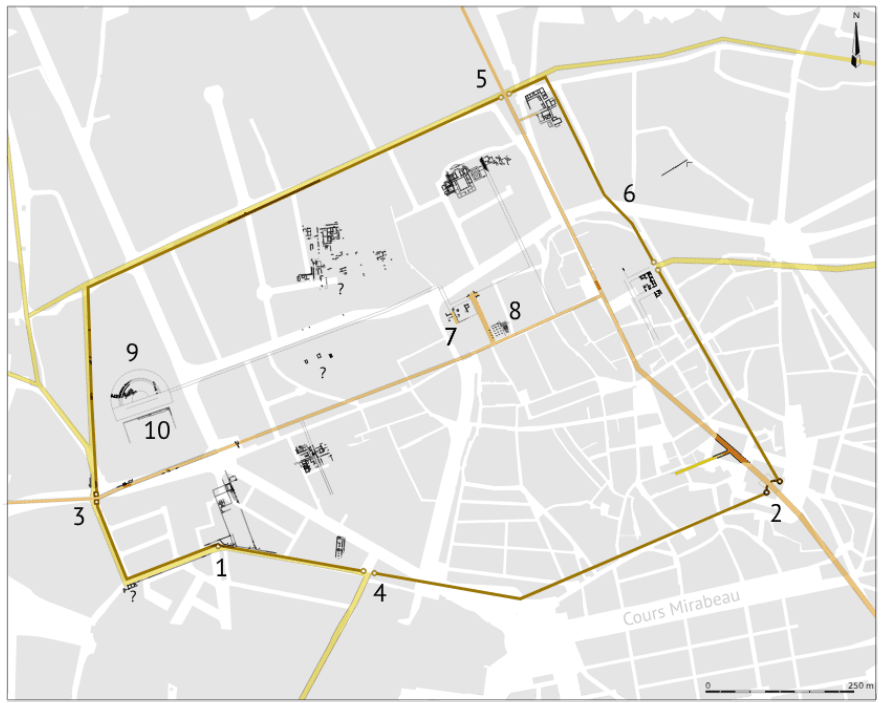 Une des caractéristiques de cette fortification est le tracé très rectiligne de ses différents tronçons de courtine. Au nord, sa trajectoire est restituée en rive sud de l’avenue Henri-Pontier ; à l’ouest, elle traverse en ligne droite l’enclos de la Seds sur près de 450 m de long ; au sud, elle empruntait la même direction que l’actuelle rue Irma-Moreau ; à l’est, enfin, son tracé se confond avec celui de la muraille du bourg Saint-Sauveur au XIe siècle, désignée au Moyen Âge sous le nom de recta linea (en rive ouest de l’actuelle rue Pierre-et-Marie-Curie). On ne lui connaît pour l’heure qu’une seule tour de flanquement, édifiée à un point d’inflexion de son tracé, dans la rue Irma-Moreau (n° 1 du plan), ainsi que deux portes : la porte dite d’Italie, connue depuis la fin du XVIIIe siècle et qui, au sud-est, laissait le passage à la voie Aurélienne au travers d’une cour à cavaedium (n° 2 du plan), et celle récemment mise au jour à l’ouest, à la faveur de travaux de viabilité, et par laquelle la même voie sortait de la ville pour rejoindre Arles (n° 3 du plan). Au moins trois autres portes doivent cependant être restituées : l’une au sud, au départ de la via Massiliensis (au raccord entre la rue Irma-Moreau et la traverse du Bras-d’Or) (n° 4 du plan ), une autre, au nord, dans l’axe du cardo maximus qui devait se prolonger sous la forme d’une route en direction de Puyricard et de la Durance (avenue Philippe-Solari) ; la troisième, à l’est, peu ou prou dans l’axe du boulevard Aristide-Briand (n° 6 du plan).