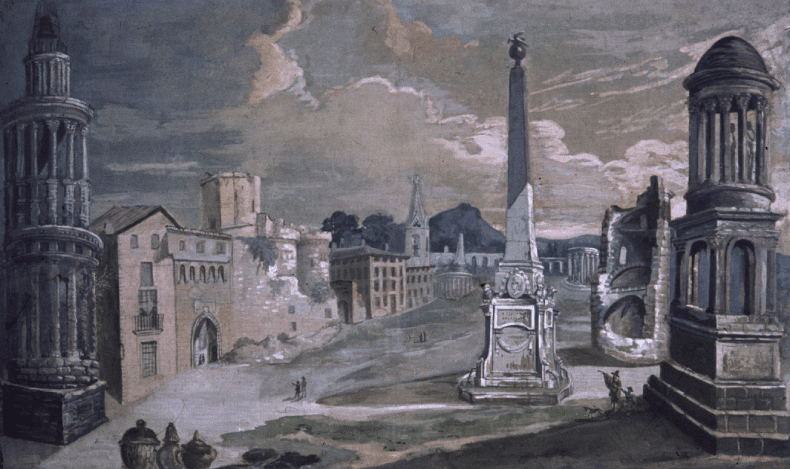 - Représentation fantaisiste du mausolée aixois (à gauche) mis en perspective avec celui du Glanum (à droite) avec à l’arrière l’une des tours de la porte sud-est d’Aix antique - Huile sur toile fin XVIIIe/début XIXe siècles - Collection Musée Granet