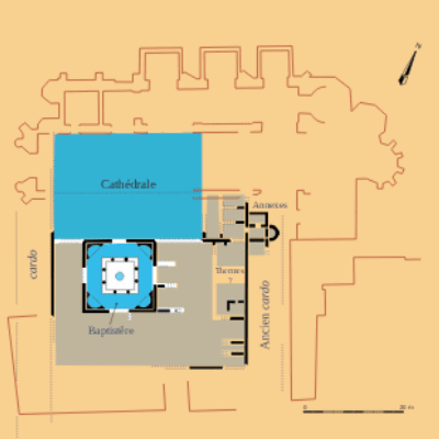 À quoi il faut ajouter, comme on l’a dit, la possible, voire probable installation d’une résidence épiscopale dans l’îlot d’habitation installé sur l’autre rive du cardo qui longeait les édifices de culte et leurs annexes. L’hypothèse est d’autant plus vraisemblable que les recherches récentes de Françoise Paone auprès de la cathédrale de Marseille ont montré que, dans cette ville, le palais épiscopal antique était également séparé du groupe cathédral par une rue.