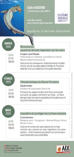 Retrouvez le programme des conférences organisées par le Muséum d’Histoire Naturelle d’Aix-en-Provence en cliquant ci-dessous :
