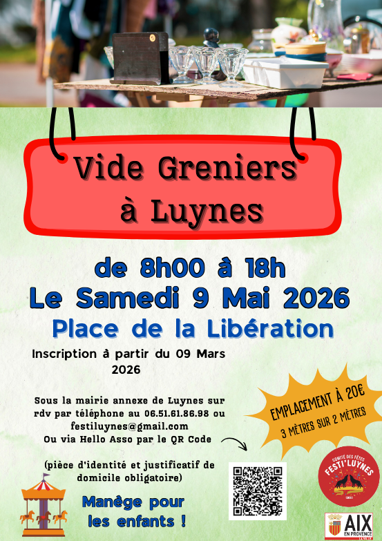 Ce samedi 9 mai 2026, Festi’Luynes organise un vide-greniers à Luynes, place de la Libération.